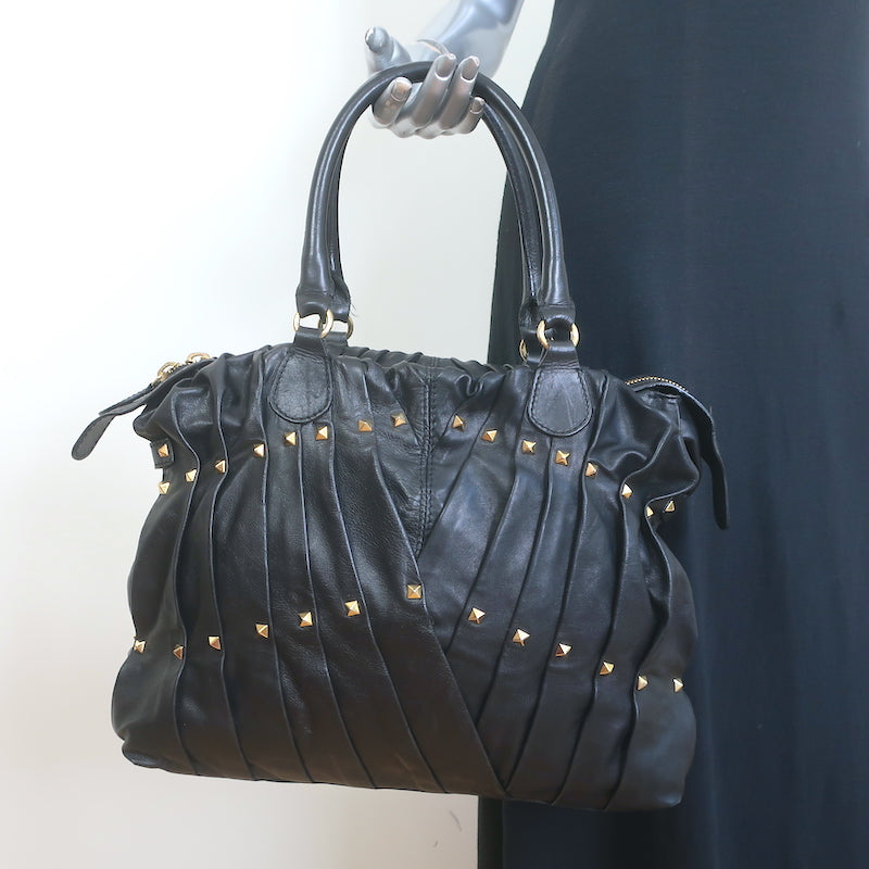 Valentino Maison Studded Tote Black Pleated Leather Large Shoulder Bag Measurements