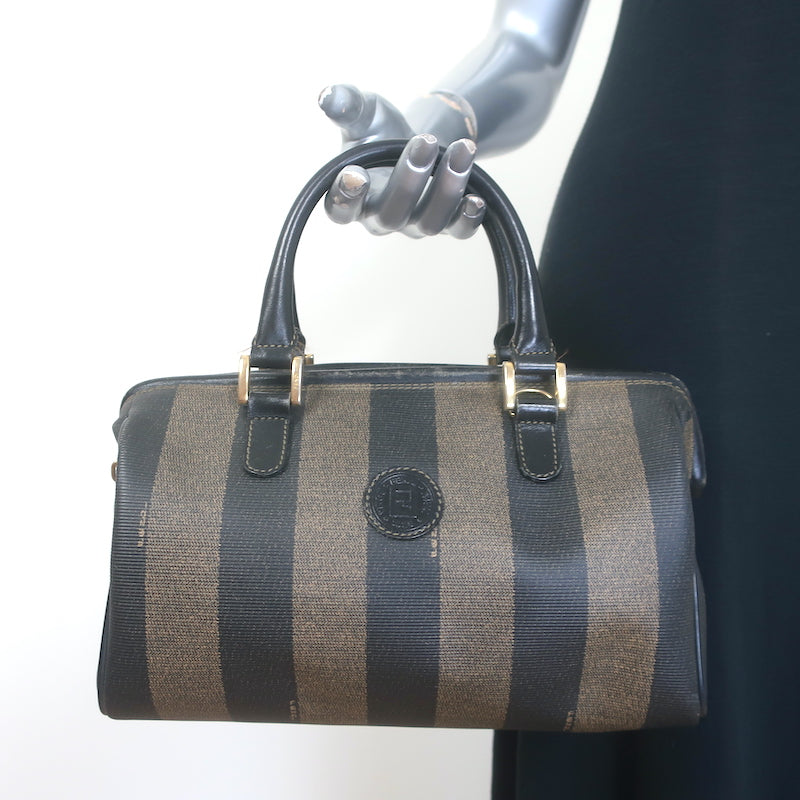 Meet the timeless sophistication of the vintage Fendi Pequin small Boston in brown striped canvas, a compact top-handle that delivers iconic heritage with everyday ease.