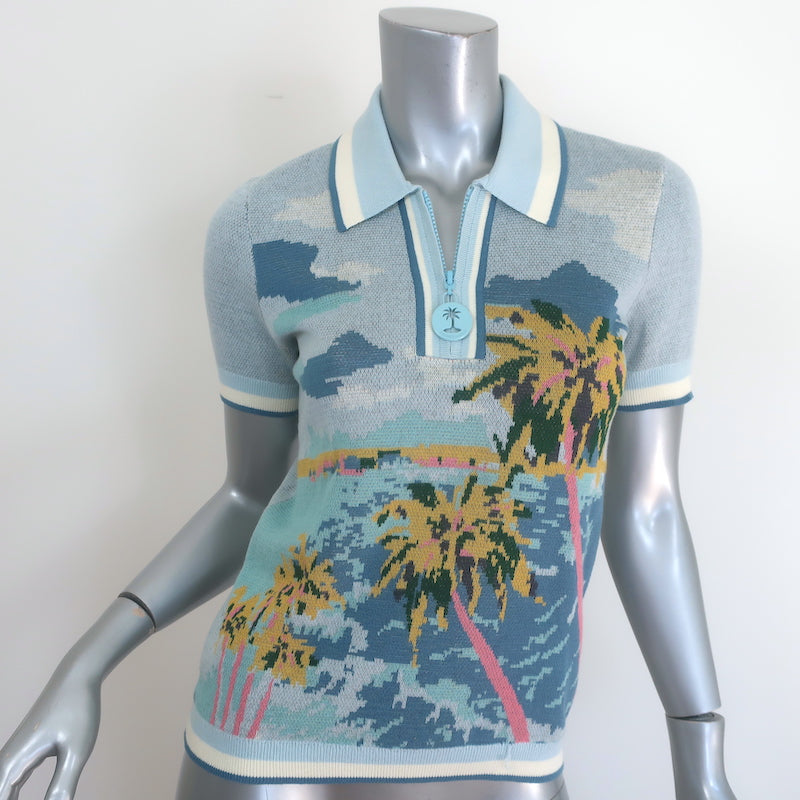 Zimmermann Cira Palm Tree Jacquard Knit Polo Shirt Blue Size 0 Measurements